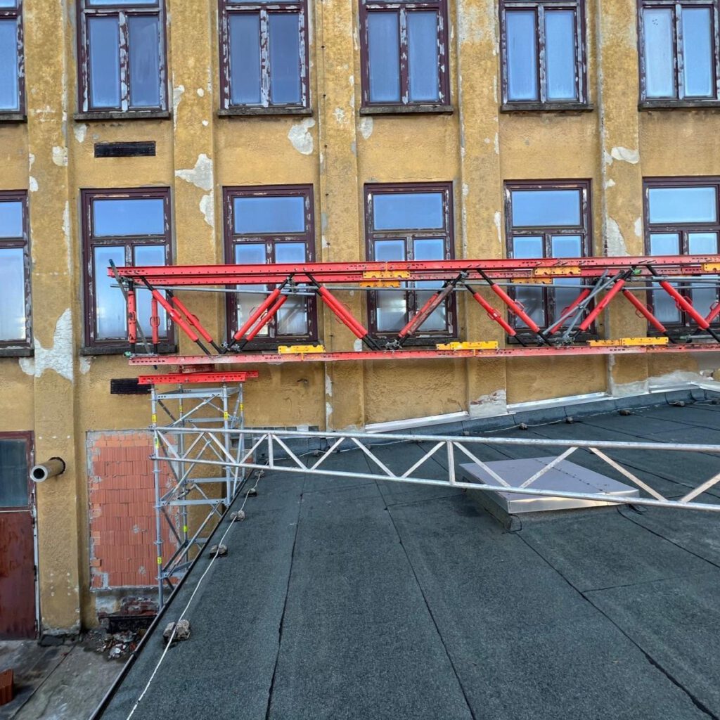 Wir überspannen einen Anbau mit rund 17 Metern und montieren dafür eine Schwerlastüberbrückung aus dem Variokit System von Peri, damit die Lasten zuverlässig abgetragen werden. Die komplette Konstruktion haben wir auf unserem Lagerplatz millimetergenau vormontiert. Das spart Zeit, sorgt für einen reibungslosen Ablauf und bietet der Stadtverwaltung Geyer eine wirtschaftliche Lösung.